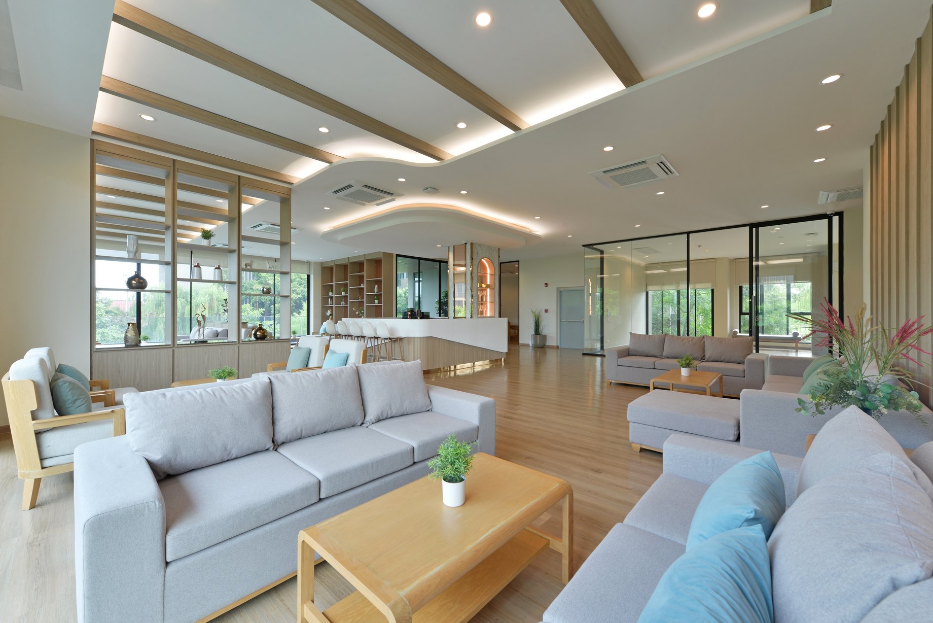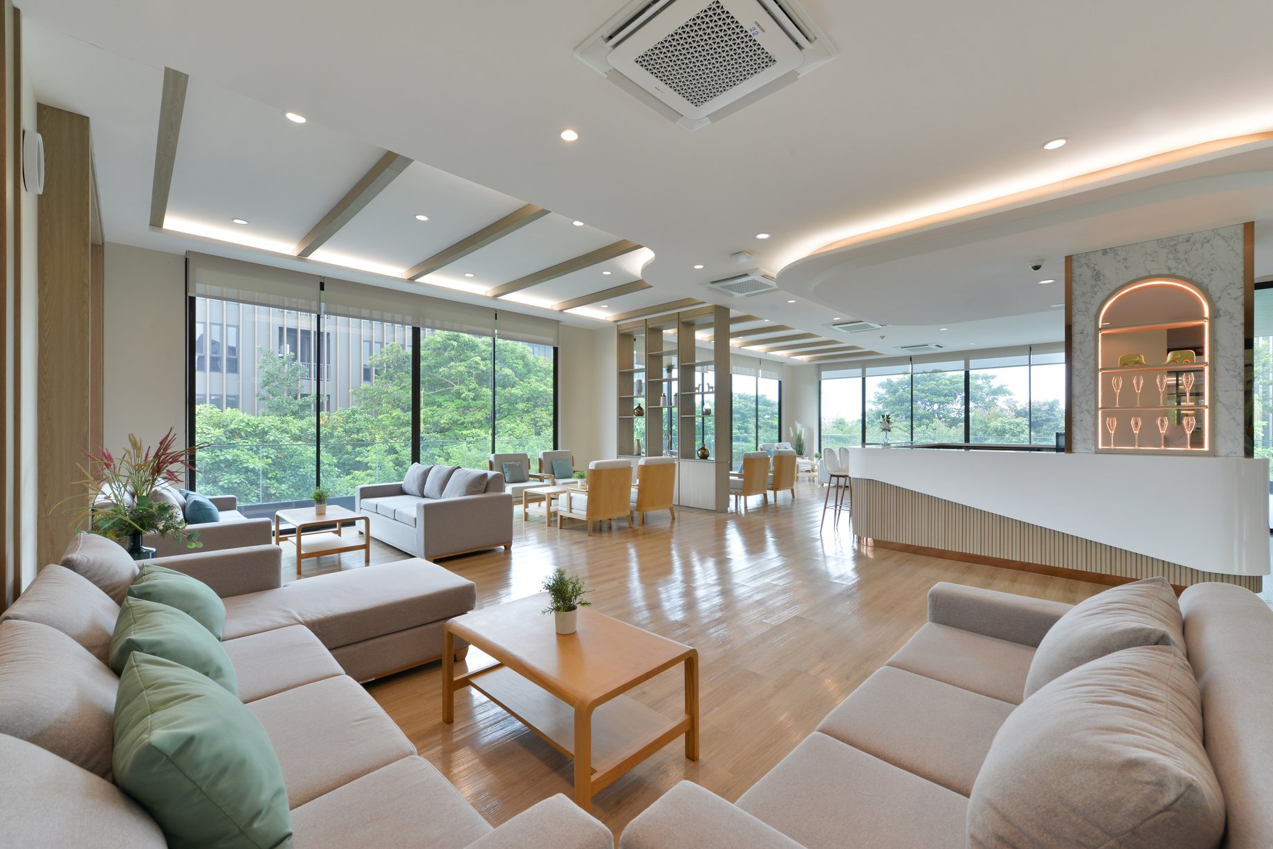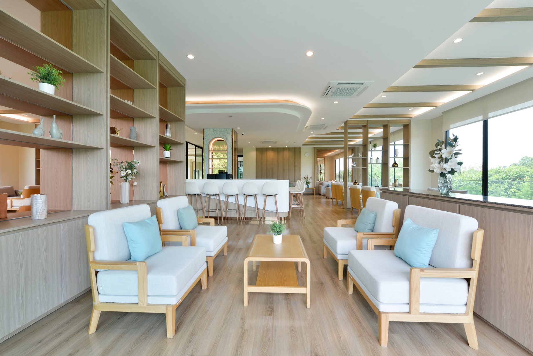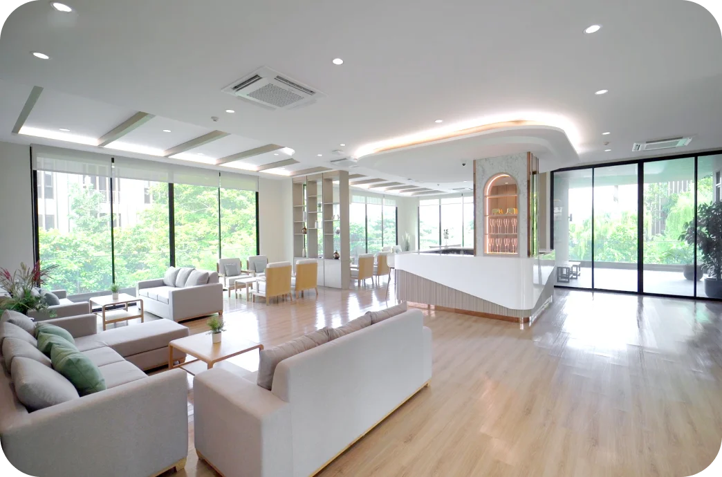 พื้นที่เอนกประสงค์แห่งนี้ถูกออกแบบมาให้เป็นมุมพักผ่อนและพบปะในบรรยากาศโปร่งสบายและอบอุ่น ผสานกับทิวทัศน์สีเขียวจากโซนกลางของโรงแรมที่มองเห็นได้ผ่านผนังกระจกบานใหญ่ ทำให้ธรรมชาติเข้ามาเป็นส่วนหนึ่งของช่วงเวลาการพักผ่อนของคุณไม่ว่าจะนั่งอ่านหนังสือ จิบกาแฟเบา ๆ พูดคุยกับคนใกล้ชิด หรือนั่งทำงานแบบสบาย ๆ พื้นที่นี้ถูกออกแบบให้รองรับการใช้งานอย่างยืดหยุ่น และให้ความรู้สึกเป็นกันเองในทุกจังหวะของวัน